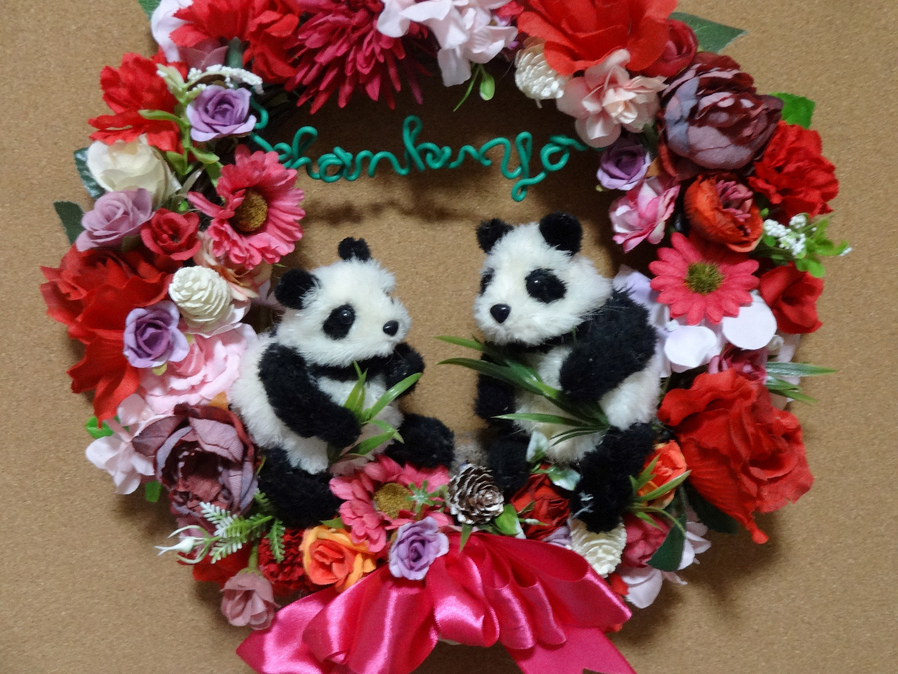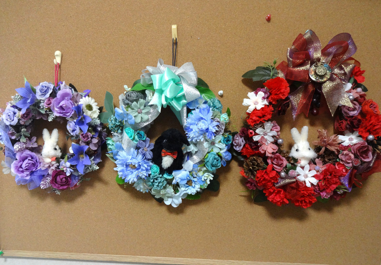 また、リースのお花はブルー系のシルクフラワーを配し、メインフォーカスは薄い絹地の薔薇を折り紙の